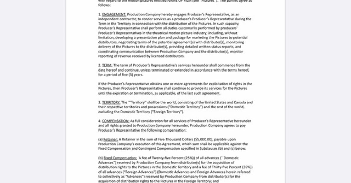 5-page Agreement with Film Producer or Production Company to act as Representative with Distributors Film Contract Template Challenge Add to cart Price 59,00 $ Distribution Contracts