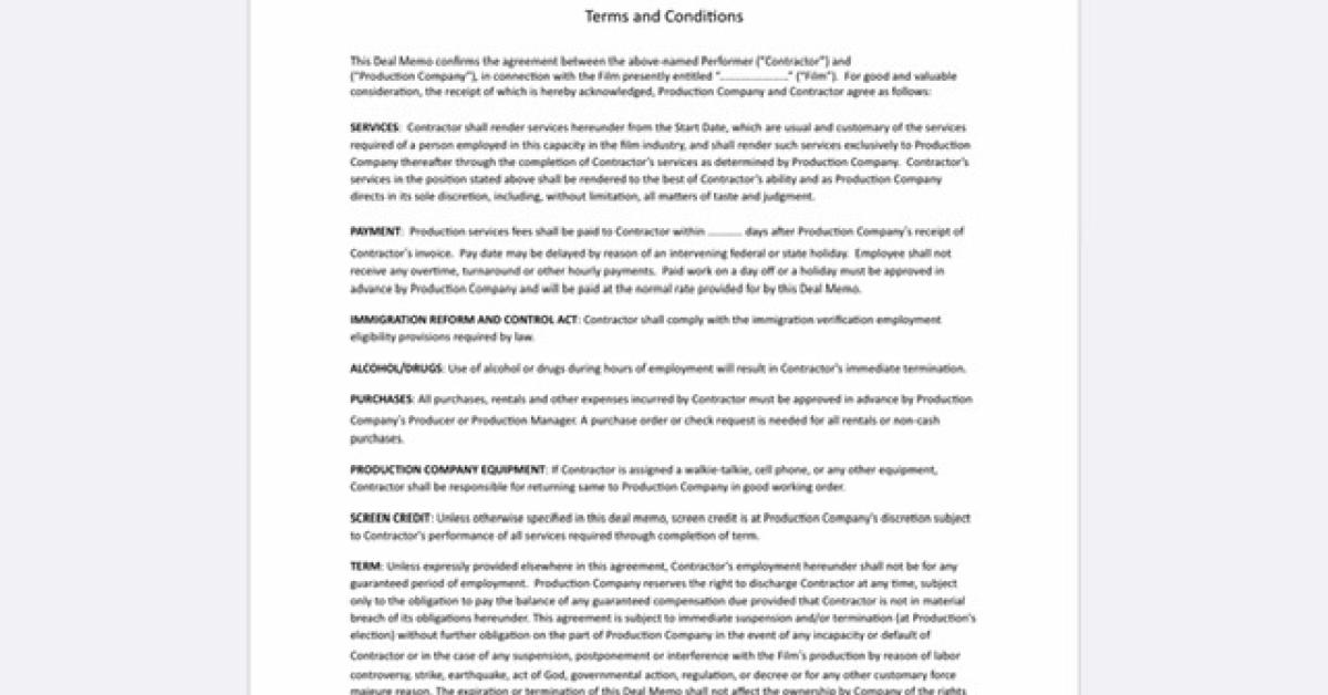 3-page contract with actors on a film production. Performers Agreement. This Deal Memo confirms the agreement between the above-named Performer (Contractor) and (Production Company), in connection with the Film presently entitled (Film).